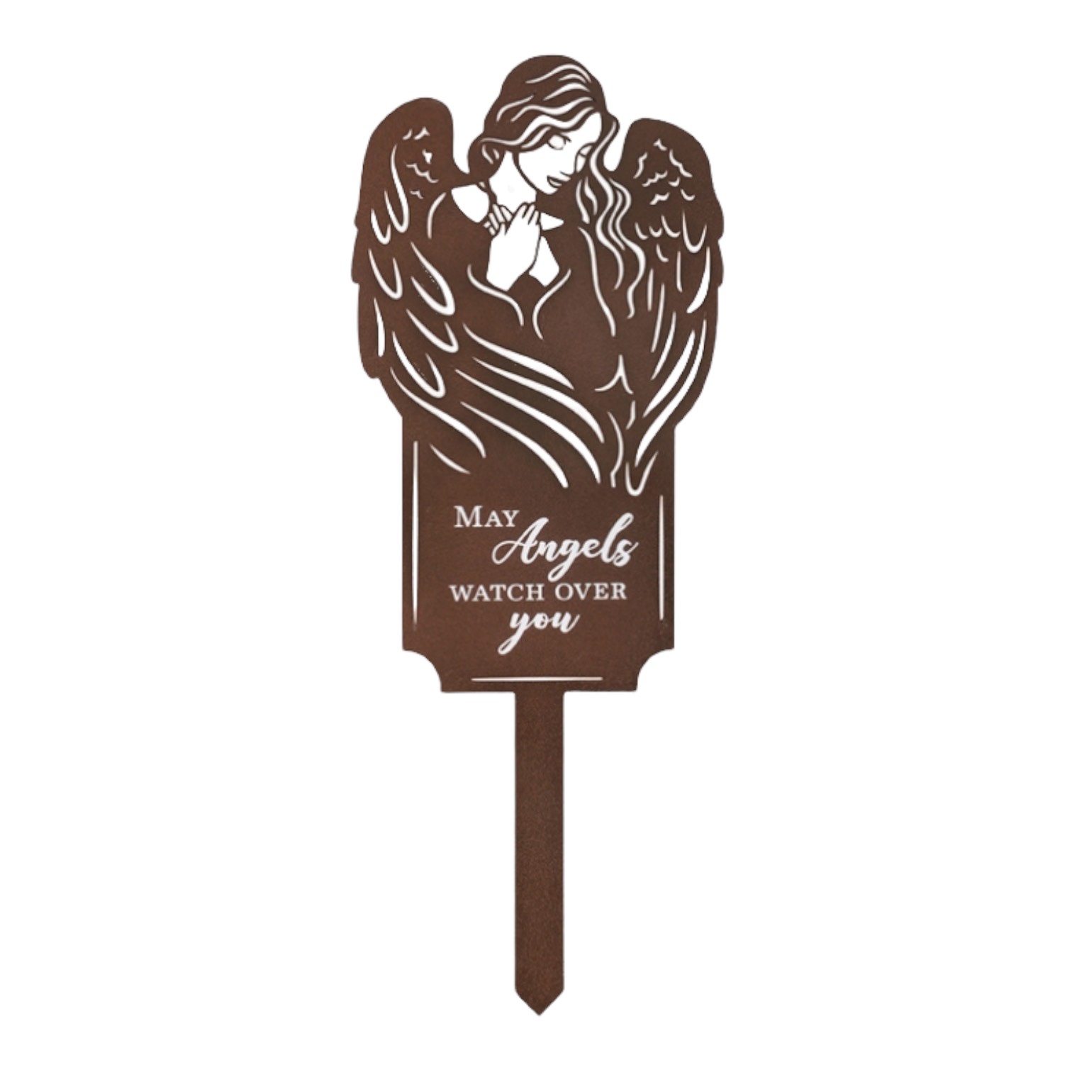 This memorial garden stakes is made of rustic colored powder-coated metal. The message reads “May angels watch over you.” It measures 15 inches high and 5 inches wide.