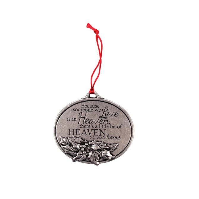 This decorative Christmas ornament is made of pewter with a red ribbon. The message reads “Because someone we Love is in Heaven, there’s a little bit of Heaven in our home.” It is 3.75 inches wide by 3 inches high.