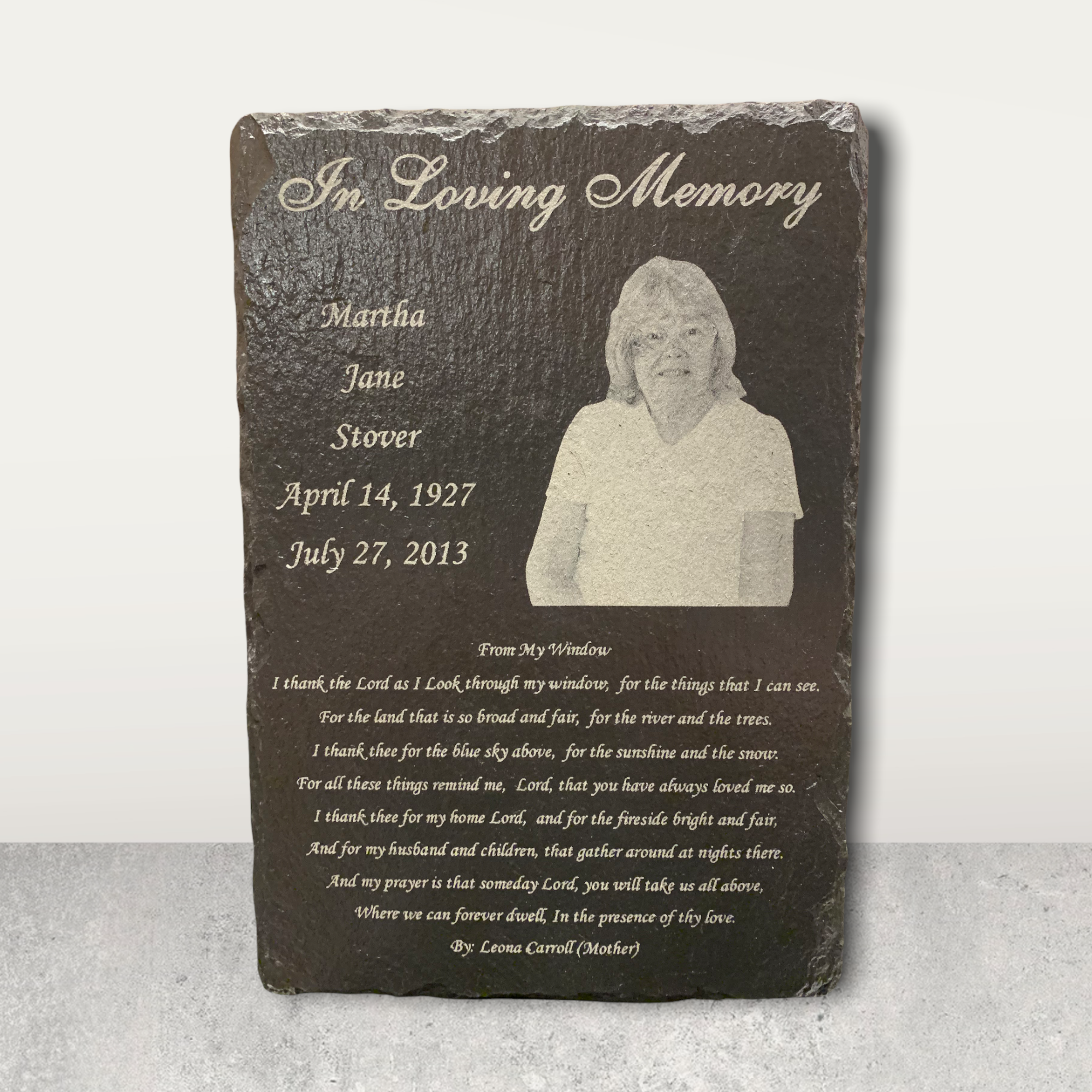 Honor a loved one with a beautifully handcrafted Personalized Memorial Plaque. Each plaque is carefully engraved on sturdy 4×4 inch slate, sealed for durability, and perfect for both indoor and outdoor use.