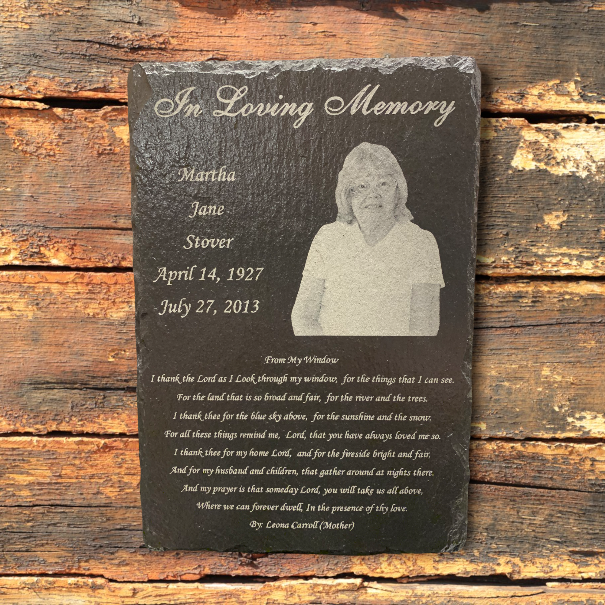 Honor a loved one with a handcrafted Personalized Memorial Plaque. Engraved on sturdy slate and sealed for both indoor and outdoor use, each plaque is fully customizable with your photo and message.
